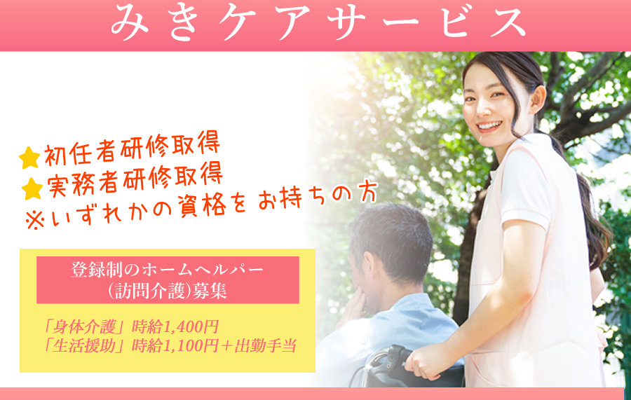 ・初任者研修取得(旧ヘルパー2級) ・実務者研修取得(旧ヘルパー1級) ※いずれかの資格をお持ちの方